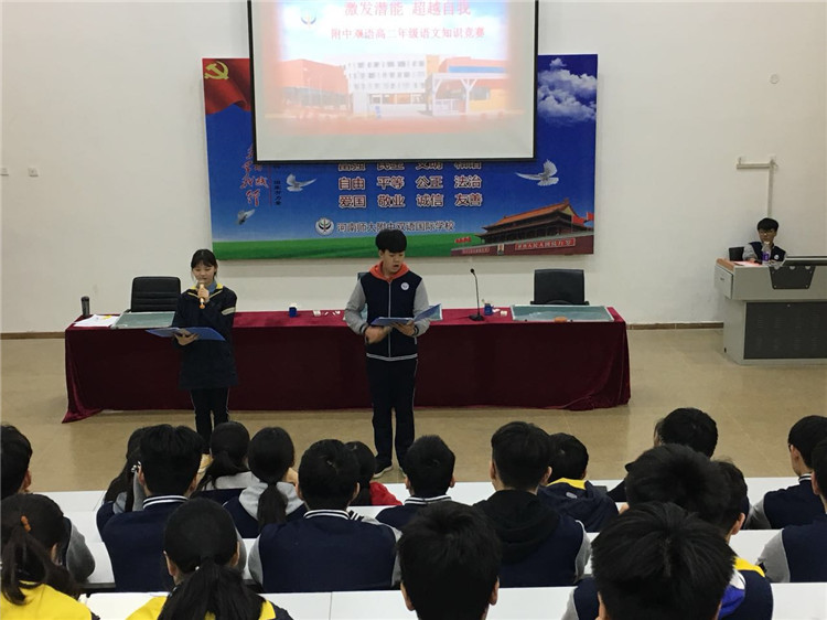 五千年文化,三千年詩韻。中國文化博大精深,尤其古詩文是中華文化寶庫中璀璨的一顆明珠。在高中階段的學(xué)習(xí)以及高考考試中占有相當(dāng)大的比重。為了激發(fā)孩子們學(xué)習(xí)古詩文的興趣,展示已學(xué)古詩文的掌握和理解情況,4月13日,經(jīng)過一輪班級測試的海選,高二年級來自四個(gè)班的四支班級代表隊(duì)集結(jié)完畢,整裝待發(fā),在附中雙語中學(xué)部主任溫志忠、高二年級主任和全體教師的見證下,激烈的比賽拉開了帷幕。