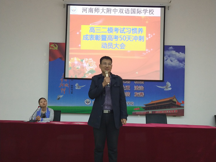 隨后,年級主任白運亮發(fā)言。他的話既深刻又溫情,飽含了對高三學子的殷切期盼。接著,學部主任溫志忠作重要講話。他對高三全體師生提出了新的期望,對同學們的學習生活提出了更高的要求。他滿懷信心、慷慨激昂的講話贏得了全體師生熱烈的掌聲。