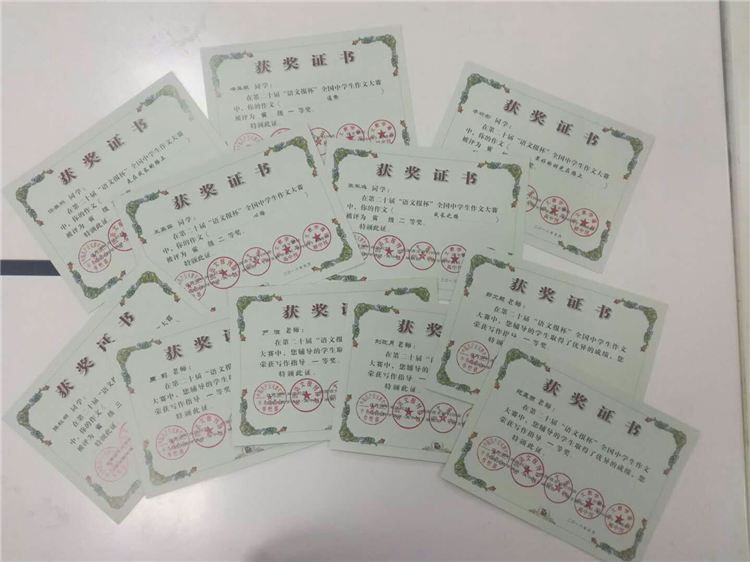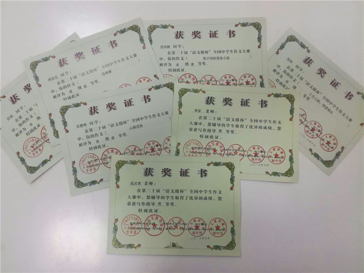 在第20屆語文報比賽中,我校冷亞航、范林靜、張慧琳等同學斬獲一等獎,陳佳藝等同學獲二等獎,張涵、張科等同學獲三等獎,范靈營、李彥、劉改月、郭文毅、嚴潔、范孟雨、周莉等七位老師獲寫作指導一等獎。