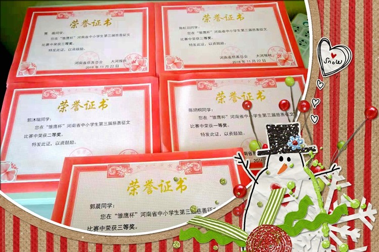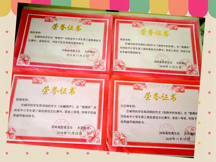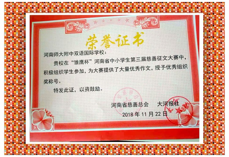 “雛鷹杯”河南省中小學(xué)生第三屆慈善征文比賽獲獎結(jié)果于2018年11月25日上午揭曉,我校黨支部書記兼教科研發(fā)中心主任李現(xiàn)山代表學(xué)校趕赴鄭州參加了頒獎典禮,值得祝賀的是我校5名選手從7萬多名參賽選手中脫穎而出,初中組征文共有17篇作文獲獎,我校占5篇,以絕對的比例成為本次頒獎典禮上的焦點(diǎn),初一11班陳玥桐同學(xué)榮獲一等獎,初二3班郭沐瑞同學(xué)榮獲二等獎,初三2班郭晨、初二1班陳虹羽、初三2班賈薇3名同學(xué)喜獲三等獎;王志坤、郭慧、孫彤、周莉4名老師榮獲“優(yōu)秀輔導(dǎo)教師”稱號,河南師大附中雙語國際學(xué)校被授予優(yōu)秀組織獎稱號!