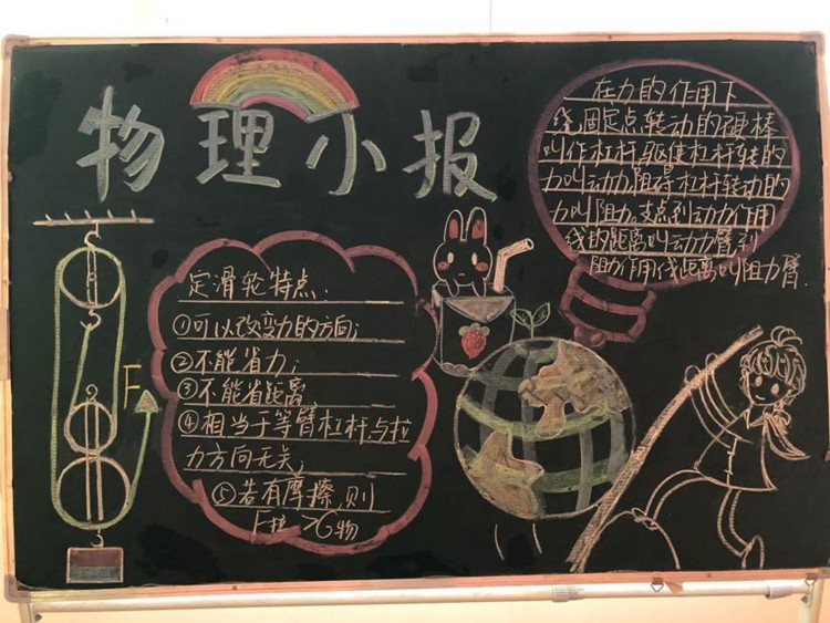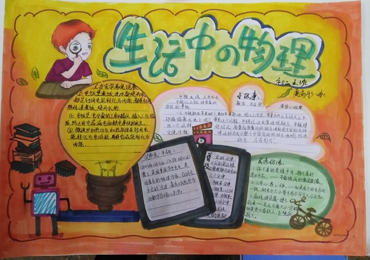 初二年級(jí)做了知識(shí)點(diǎn)系列手抄報(bào),制作的杠桿滑輪知識(shí)專題,描述準(zhǔn)確,總結(jié)全面,制圖精美,不少同學(xué)愛不釋手。初三年級(jí)制作的電學(xué)專題,做成了知識(shí)樹的形式,概括全面,圖文并茂,引得不少同學(xué)駐足觀看。高一年級(jí)制作的奇妙的物理,講述了人造衛(wèi)星原理、分類、用途等方面,吸引了一大批天文愛好者。高二年級(jí)制作的電磁學(xué)手抄報(bào),講述了電磁學(xué)在生活中的用途,提高了學(xué)生應(yīng)用物理解決實(shí)際問題的意識(shí)。高三年級(jí)制作了復(fù)習(xí)方法考試技巧方面的板報(bào),提升了學(xué)生的復(fù)習(xí)效率和得分技巧。