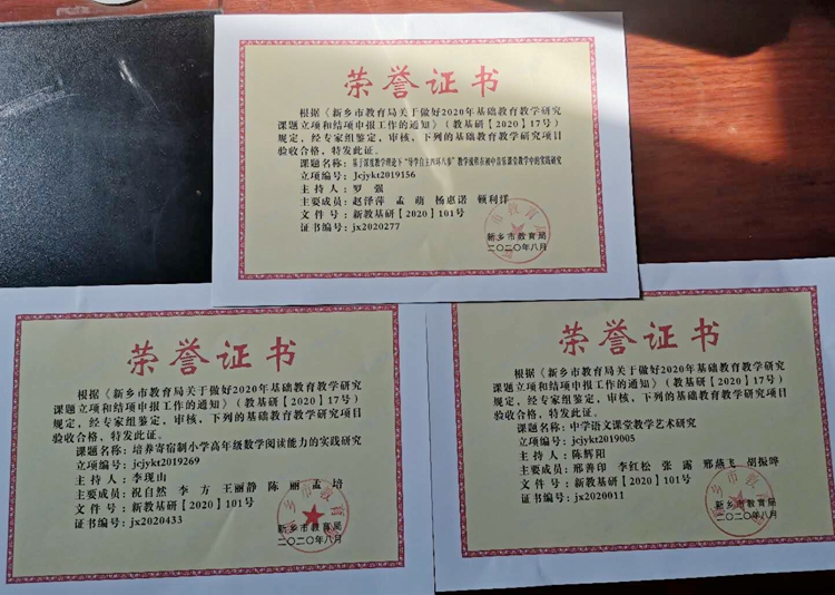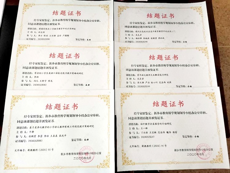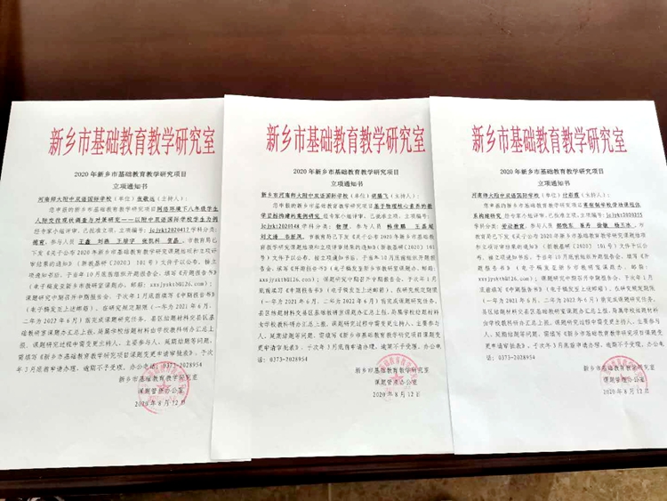 市基礎(chǔ)教研室按照評審標準、程序、辦法,分別對2020年申報結(jié)項和立項的課題材料進行了嚴格的評審,我校羅強副校長、李現(xiàn)山書記、陳輝陽老師主持的2019年基礎(chǔ)教育教學(xué)研究課題均成功結(jié)項,付彩霞、胡騰飛、張敬遠3位老師主持的2020年基礎(chǔ)教育教學(xué)研究課題成功立項;祝自然、李昀、吳克彥、范靈營等6位老師主持的2019年教育科學(xué)規(guī)劃課題順利結(jié)項,通過率達100%,趙延勛、張曉崢、李晶晶、王彥崴4位老師主持的2020年教育科學(xué)規(guī)劃課題成功立項,大家積極開展課題研究,努力探索教學(xué)改革新路,教研能力和水平有了大幅提升,望今后大家再接再厲,深入推進教育教學(xué)課題研究。