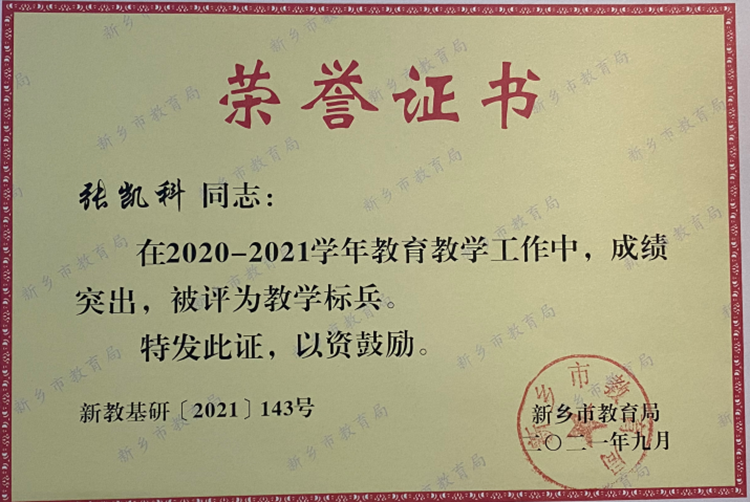 在2021年新鄉(xiāng)市教育系統(tǒng)模范班主任評選中,陳輝陽、王鑫、舒明、王陽和李方五位老師榮獲“2021年新鄉(xiāng)市模范班主任”稱號。