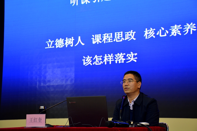 接下來,王紅奎主任為我校全體老師開展主題為《課程思政與學科育人功能的實現(xiàn)》的專題講座,從立德樹人、課程思政、核心素養(yǎng)、如何落實四個方面展開了探討。他從黨史資料為引入,回顧中國共產(chǎn)黨的奮斗征程,強調(diào)了我國倡導的“把立德樹人作為教育的根本任務(wù)”的方針,強調(diào)學生是祖國的未來和民族復興大任的擔當者,闡述了加強學生思政教育的重要性。隨后,王紅奎主任以實際課例出發(fā),針對不同學科教學的特點,現(xiàn)場講解在日常教學中如何通過巧妙的情景創(chuàng)設(shè)突出立德樹人的導向,為我校老師提供了可貴的教研樣本,做出了極具指導性的教學示范。王紅奎主任隨后對于老師們表達了深切的期盼,鼓勵老師們提升個人教學能力、緊跟國家教育導向,把學生們培養(yǎng)成新時代國家發(fā)展需要的人才。講座結(jié)束,老師們意猶未盡,如沐春風,收獲滿滿。