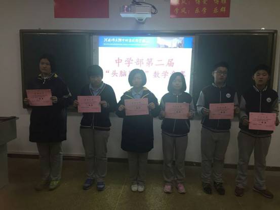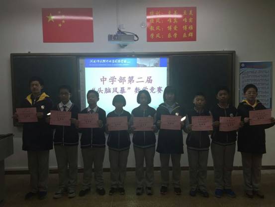 11月4日,緊承第一屆頭腦風(fēng)暴的熱潮,河南師大附中雙語國際學(xué)校初一年級第二季“頭腦風(fēng)暴”數(shù)學(xué)競賽有聲有色地展開了,這一次針對學(xué)生的計算能力有了更高的要求。難度上比上次也有增加,大賽分初賽和復(fù)賽兩輪進行。經(jīng)過一番緊張的選拔,最終角逐出特等獎九名、一等獎六名、二等獎十六名、三等獎二十二名。通過這次比賽,同學(xué)們學(xué)習(xí)數(shù)學(xué)的興致日趨高漲,表示要爭做數(shù)學(xué)先進。
