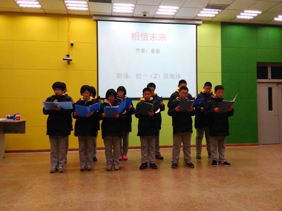 接著舉行了集體賽,各班同學(xué)激情高漲。分別朗誦了《少年中國(guó)說(shuō)》、《相信未來(lái)》、《木蘭詩(shī)》,初一3班拔得頭籌。