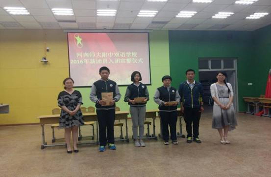 首先,校團(tuán)委體育委員許冠軍老師宣讀了新團(tuán)員名單,校團(tuán)委組織委員平靜老師、體育委員許冠軍老師、初二年級(jí)團(tuán)支部書記王彎彎老師為新團(tuán)員代表佩戴了團(tuán)徽并頒發(fā)團(tuán)員證。