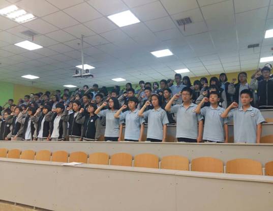 “我們是五月的花海,用青春擁抱時(shí)代。我們是初升的太陽,用生命點(diǎn)燃未來……”歌聲雄壯、激越歡快,2016年6月1日下午,河南師大附中雙語學(xué)校隆重舉行了新團(tuán)員入團(tuán)宣誓儀式。