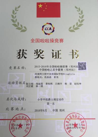 經(jīng)過激烈角逐,我校由小學(xué)部二年級(jí)學(xué)生鄒起雯、趙鈺坤、楊諾、呂桐辛、劉芷歌、景怡然、林一琪、趙文郁組成的Bling Girls隊(duì),一舉奪得本屆全國(guó)啦啦操聯(lián)賽(鄭州站)小學(xué)組爵士冠軍和河南省學(xué)生健身操舞錦標(biāo)賽小學(xué)組健身操河南省二等獎(jiǎng),以及優(yōu)秀組織獎(jiǎng)——2016年第五屆全國(guó)全民健身操舞大賽(河南賽區(qū))暨河南省學(xué)生健身操舞錦標(biāo)賽精神文明獎(jiǎng)。同時(shí),也收到了來自組委會(huì)的邀請(qǐng)函,推薦我校代表隊(duì)參加全國(guó)聯(lián)賽以及國(guó)際聯(lián)賽。