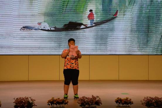 下午4:30左右,家長們已陸陸續(xù)續(xù)到達(dá)學(xué)校,劇場外的走廊上早已擺好了學(xué)生們在興趣課期間的優(yōu)秀書法和繪畫作品展。下午5:00,興趣課匯報演出在莊嚴(yán)的升旗儀式中拉開帷幕,全體師生起立向五星紅旗致敬。之后全體人員共同回顧了這七天興趣課期間的點(diǎn)點(diǎn)滴滴,有活力四射的籃球課、樂趣多多的外教口語課、優(yōu)雅多姿的形體舞蹈課以及孩子們在餐廳用餐、操場游戲、宿舍住宿等相關(guān)生活場景……光與影的變化,情與景的交融,滿滿的都是成長與感動。雖然一個班的同學(xué)僅僅相處了7天,但是仍然在同學(xué)們之間建立了真摯的友誼,在照片播放過程中,不少同學(xué)的眼角已泛著晶瑩的淚光。