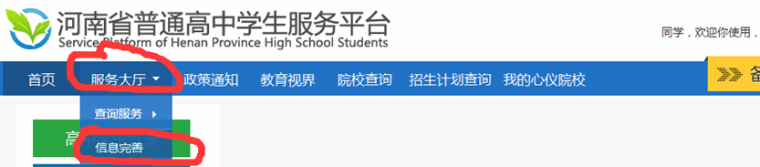 登錄“河南省普通高中綜合信息管理系統(tǒng)—>學(xué)生入口(高中學(xué)生服務(wù)平臺)—>服務(wù)大廳—>信息完善”,按照要求,確認并完善信息。