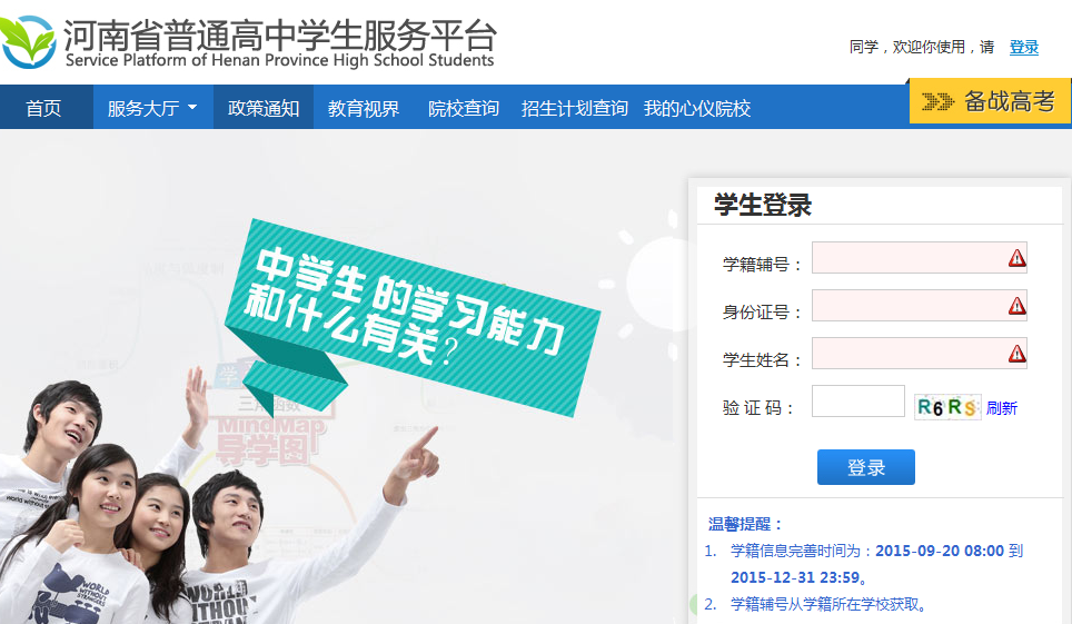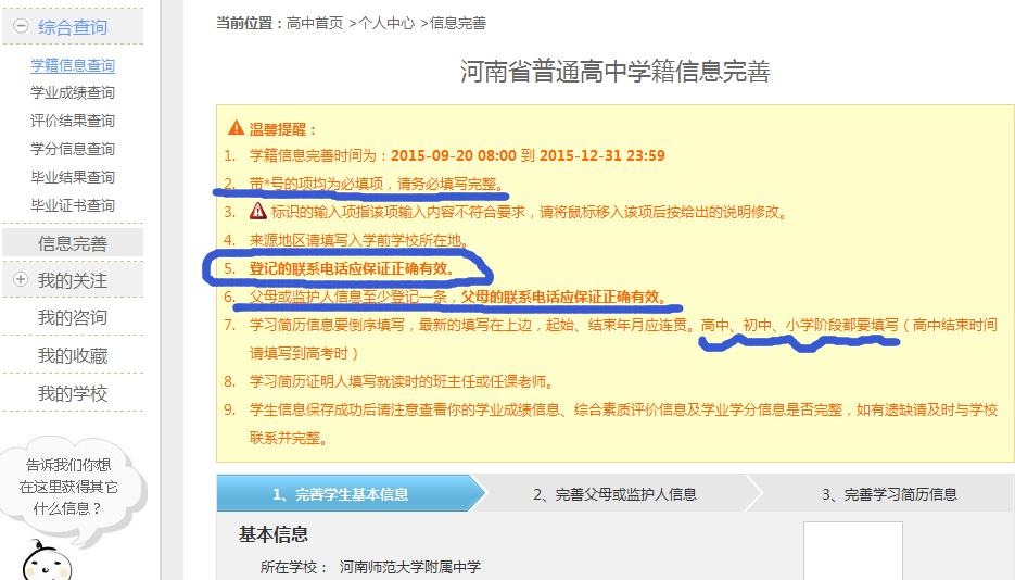 2016年中招網(wǎng)上正式錄取到附中雙語國際學(xué)校,且已按時報到入學(xué)、省網(wǎng)已經(jīng)分配學(xué)籍輔號的高一新生,均需要進行完善信息;否則,無法進行學(xué)籍照相,無法成為正式在籍生。