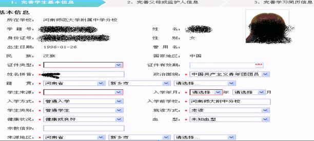 在彈出的學(xué)籍信息完善界面,學(xué)生或監(jiān)護人認真閱讀頁面中的“溫馨提醒”,熟悉填寫要求后,對“1、學(xué)生基本信息,2、父母或監(jiān)護人信息,3、學(xué)習(xí)簡歷信息”等每一項內(nèi)容逐項填寫,要求信息填寫完整、準(zhǔn)確。