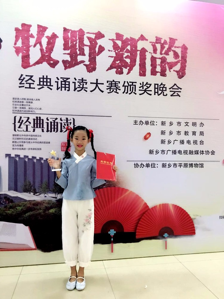 9月8日,由新鄉(xiāng)市文明辦、新鄉(xiāng)市教育局、新鄉(xiāng)廣播電視臺主辦,新鄉(xiāng)市平原博物館協(xié)辦的“牧野新韻”經(jīng)典誦讀大賽復賽,在我市新聞廣播電視臺舉行。我校小學部四一班鄒起雯經(jīng)過層層篩選,一舉獲得大賽小學組第一名。