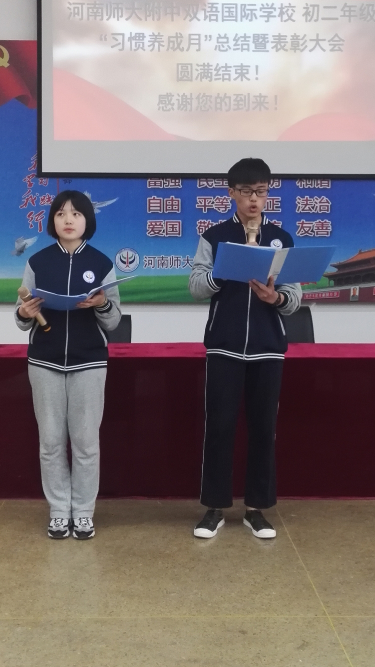為貫徹學(xué)?!皩W(xué)規(guī)矩,養(yǎng)習(xí)慣”的號(hào)召,使學(xué)生養(yǎng)成良好的行為習(xí)慣。4月3日,河師大附中雙語(yǔ)國(guó)際學(xué)校初二年級(jí)召開(kāi)“習(xí)慣養(yǎng)成月”總結(jié)表彰大會(huì)。