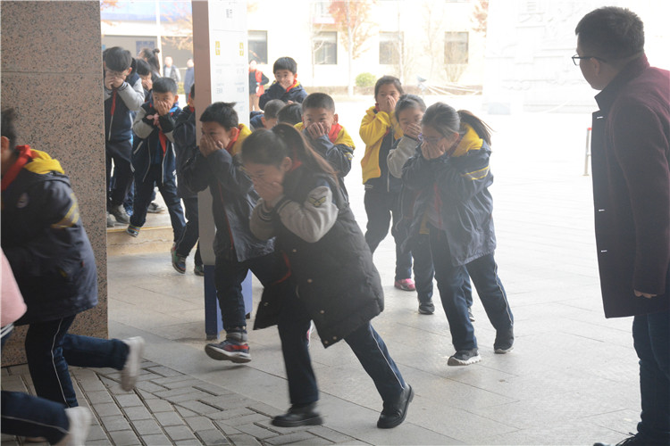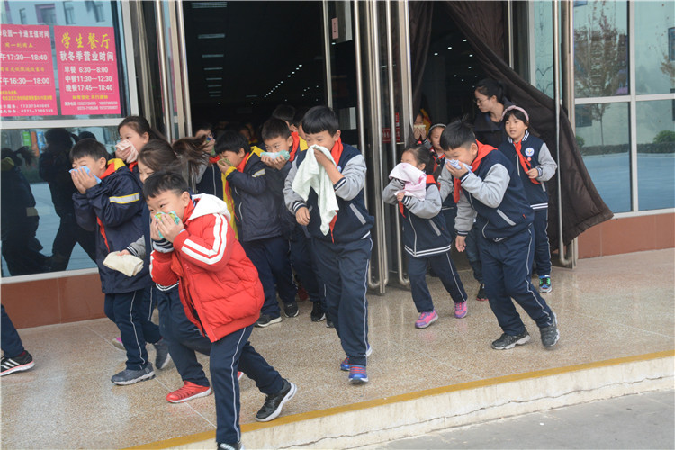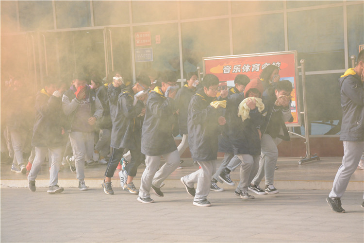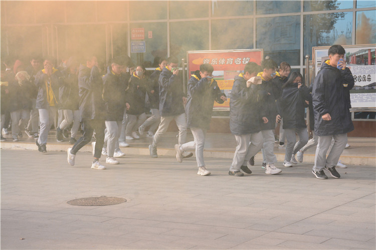 上午9:30分,教學(xué)樓前突然濃煙滾滾、煙霧彌漫,與此同時(shí),消防疏散的警報(bào)聲大作,緊接著,學(xué)生們拿出平時(shí)備用的小毛巾迅速地用水澆濕并捂住口鼻,在班主任老師的帶領(lǐng)下貓著腰有序地前行;安全責(zé)任人指明師生的疏散方向,樓梯拐角處安全責(zé)任人在高聲的提醒學(xué)生不要擁擠;學(xué)生從各教學(xué)樓、各層、各班有序地撤離,迅速跑向操場。整個(gè)過程僅用了3分多鐘,全校近三千名學(xué)生安全有序地疏散到操場上。